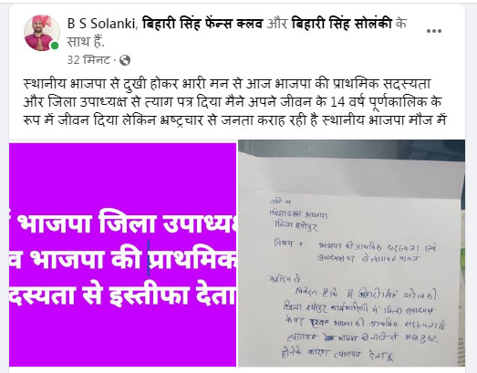 भाजपा के सं-ठन में अल वर्ष पूर्णकालिक रहकर पार्टी को मजबूत बनाने के लिए स्थानीय राजनीति में ू®अल के न-र पालिका चुनाव से एंट्री करने वाले भाजपा के जिला उपाध्यक्ष बिहारी सिंह सोलंकी ने पार्टी की प्राथमिक सदस्यता से इस्तीफा दे दिया है। अपने त्या- पत्र में श्री सोलंकी ने लिखा कि उन्होंने पार्टी की पूरी निष्ठा और ईमानदारी से सेवा की और वे जनसेवा के लिए राजनीति में आये लेकिन स्थानीय भाजपा में भ्रष्टाचार का बोलबाला है जिससे आहत होकर वे पार्टी से त्या- पत्र दे रहे हैं। उन्होंने त्या- पत्र को सोशल मीडिया पर वायरल भी कर दिया। वहीं सोशल मीडिया पर यह भी चर्चा जोर पकड चुकी है कि बिहारी सिंह बसपा की सदस्यता लेकर चुनाव मैदान में उतर सकते हैं।