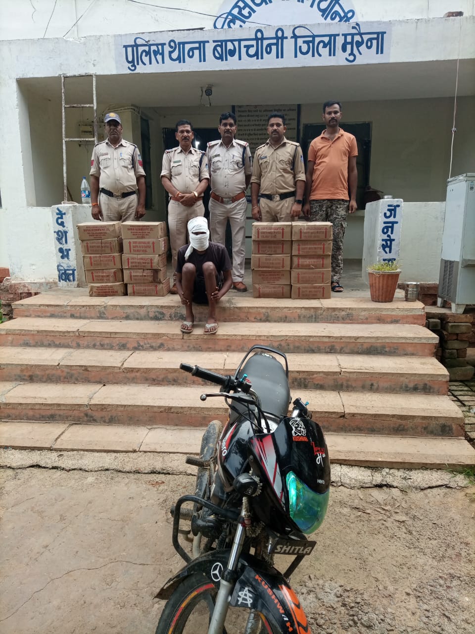 मुरैना। जिले की बागचीनी थाना पुलिस ने रविवार की सुबह ग्राम से सैंथरी ताल का पुरा खेत में बने एक घर से देशी मसाला अवैध शराब की 20 पेटी एवं एक मोटरसाइकिल बरामद की है, जबकि आरोपी पुलिस को देख कर भाग निकला। पुलिस द्वारा मामला दर्ज कर आरोपी की तलाश की जा रही है।          पुलिस अधीक्षक के निर्देश पर जिलेभर में अवैध शराब के निर्माण एवं परिवहन पर रोक लगाने के लिए अभियान चलाया जा रहा है, जिसके तहत बागचीनी थाना प्रभारी डीएस कुशवाह को मुखबिर से सूचना मिली कि सैंथरी ताल का पूरा गांव में खेत में बनी एक घर में अवैध बिक्री के लिए शराब आई हुई है। उक्त सूचना पर पुलिस टीम ने दबिश दी तो आरोपी पुलिस को देखकर वहां से भाग निकला। जब पुलिस ने घर के अंदर तलाशी ली तो देशी मसाला शराब की 20 पेटी बरामद हुई, वहीं पुलिस ने मौके से एक मोटरसाइकिल क्रमांक एमपी 06 एमटी 1870 को भी जप्त किया है। बरामद शराब एवं बाइक की कीमत डेढ़ लाख रुपए बताई गई है। बताया जाता है कि फरार आरोपी आस-पास के गांव में अवैध शराब बेचने वालों को एक दो पेटी थोक में दिया करता था। फिलहाल बागचीनी थाना पुलिस ने आबकारी एक्ट का मामला दर्ज कर आरोपी की तलाश शुरू कर दी है।